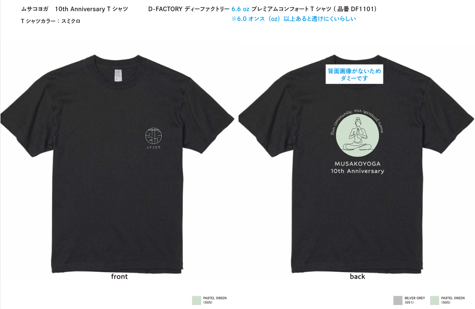 ご報告が遅くなりましたが、ムサコヨガ10周年を記念して、オリジナルTシャツを作りました!