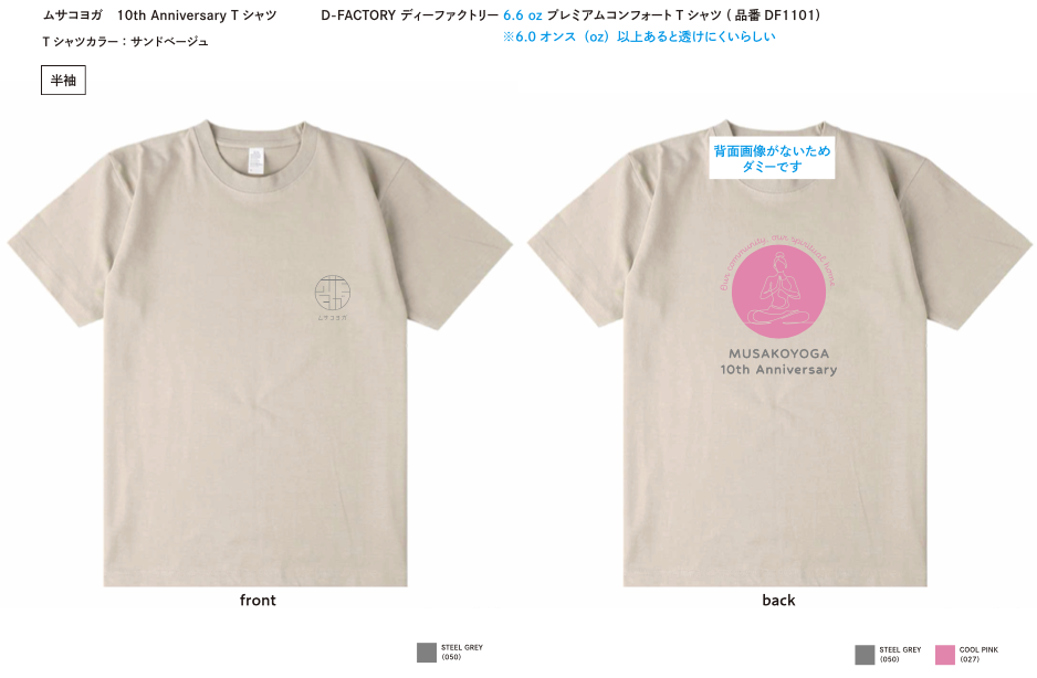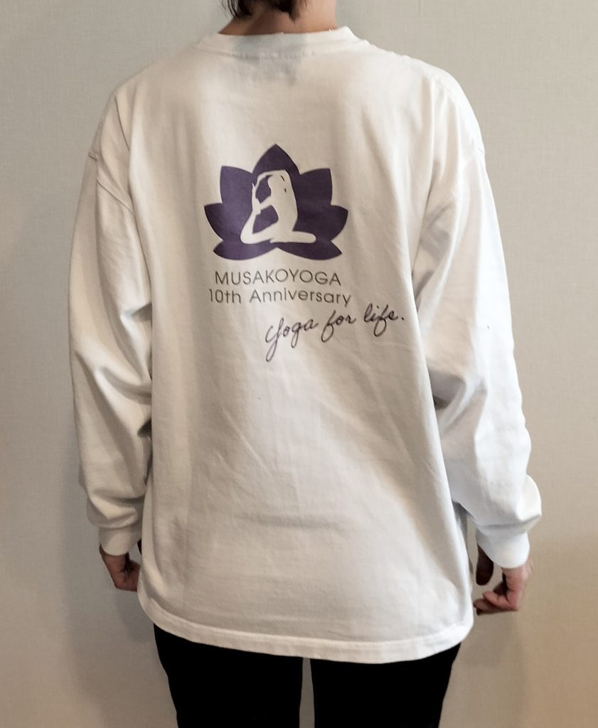 半袖と長袖の2パターンあり、それぞれ前にムサコヨガのロゴを、後ろにはイラストと10周年のメッセージが入っています♩